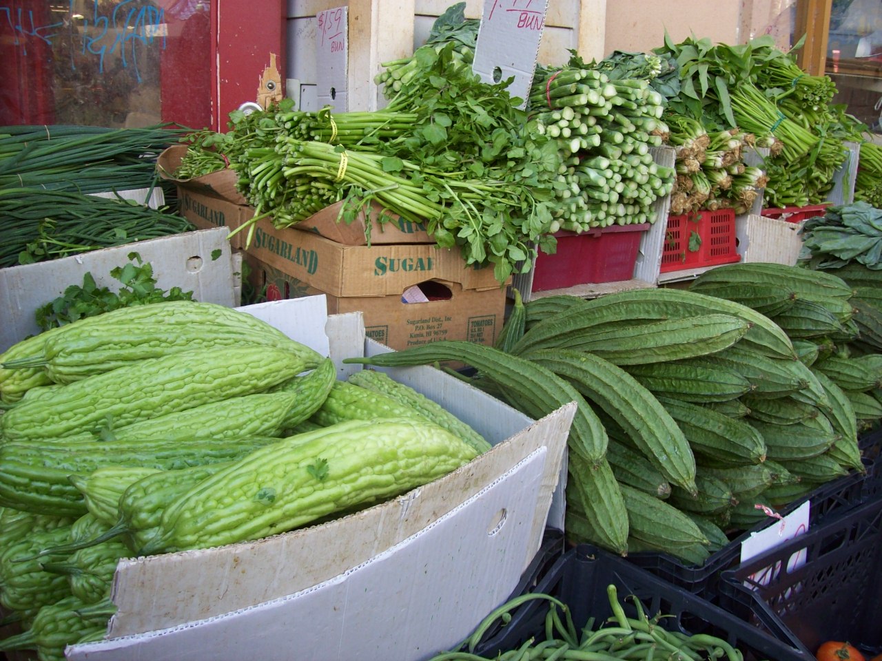 ハワイで手に入るゴーヤは切ると透き通っています。 左手前。外見も薄緑で、ぼや~んとぼやけています。沖縄のもののような濃い緑&ツブツブグリグリではありません。